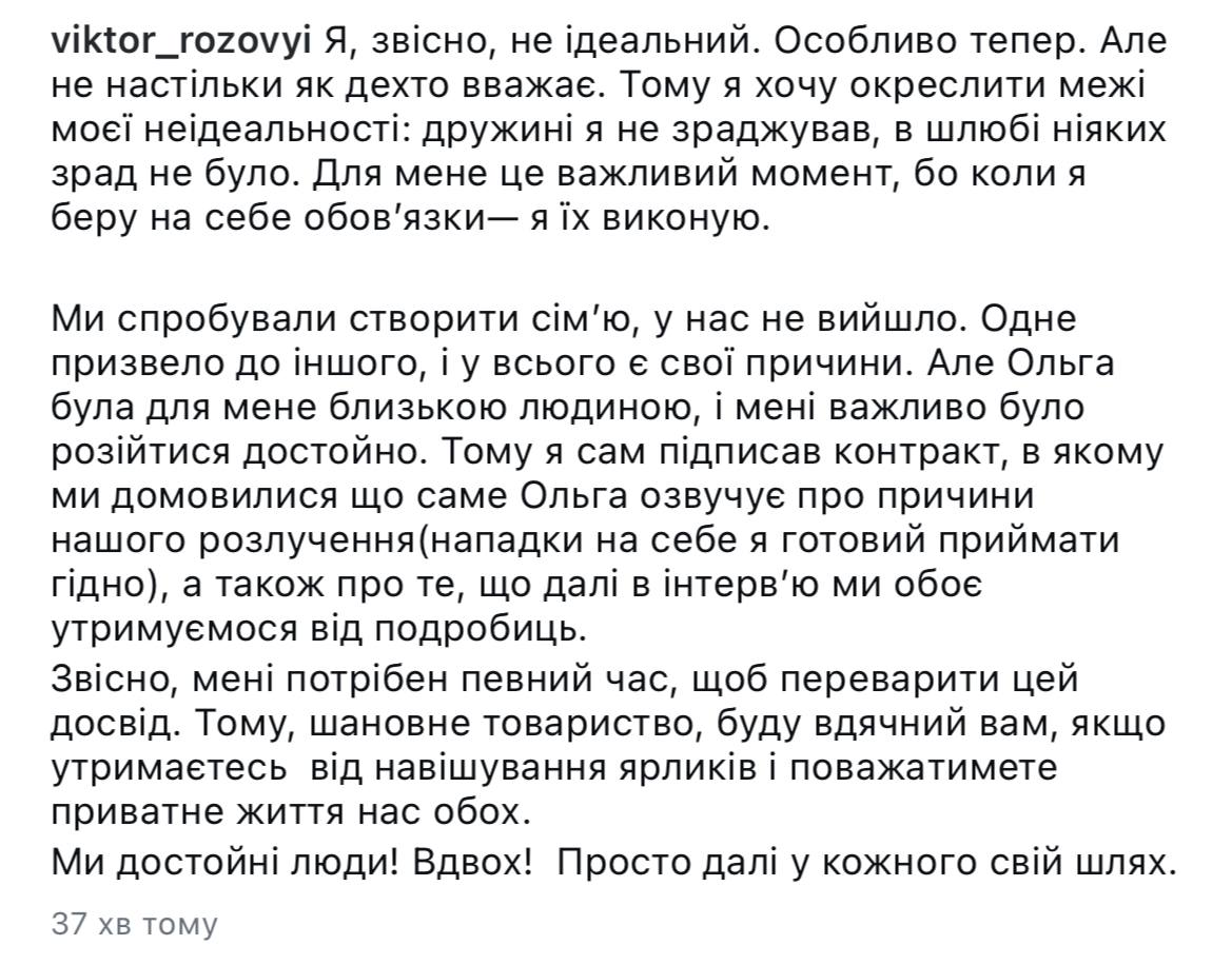 "We tried to start a family, but we failed. One thing led to another, and everything has its reasons. But Olga was a close person to me, and it was important for me to part with dignity," the man also added.
