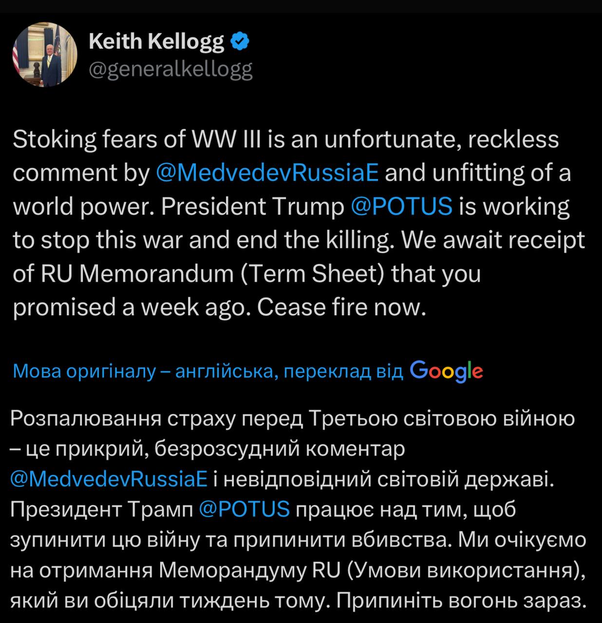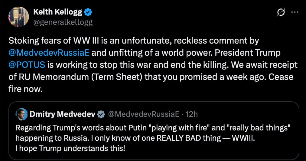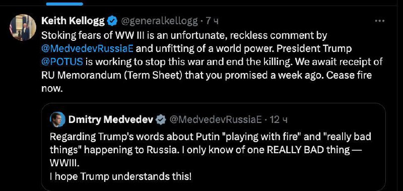 ⚫Medvedev lashed out at Trump and decided to threaten him with World War III - but immediately received a harsh response from Kellogg, who called his writing "an unfortunate and irresponsible commentary."