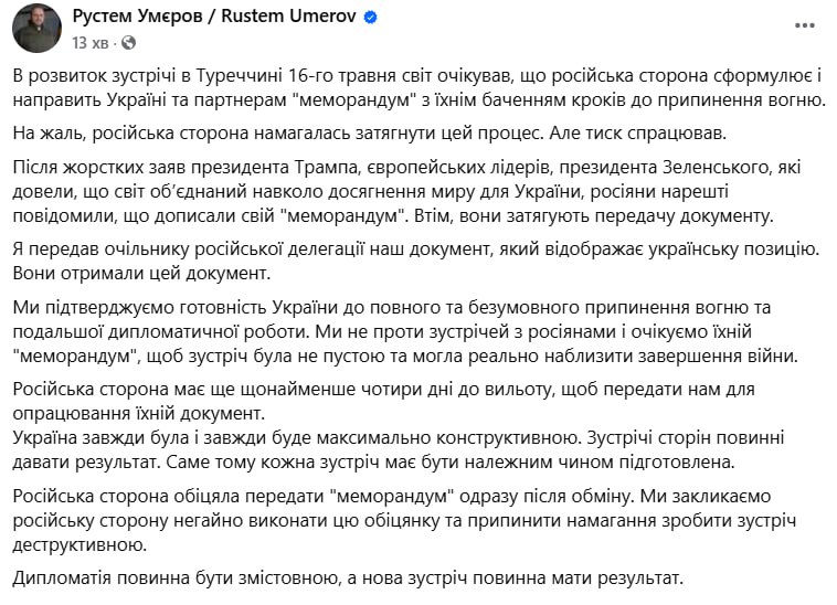 Rustem Umerov: "As a follow-up to the meeting in Turkey on May 16, the world expected the Russian side to formulate and send a "memorandum" to Ukraine and partners with their vision of steps towards a ceasefire."