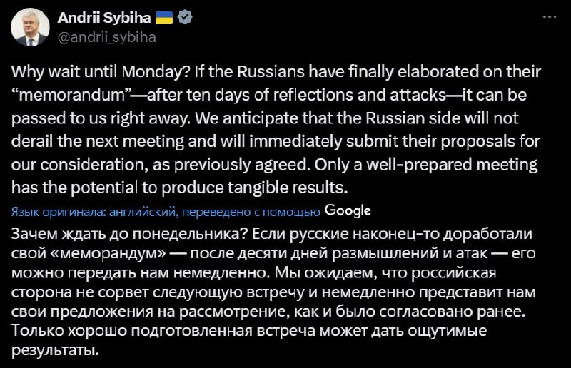 We reaffirm Ukraine's readiness for a full and unconditional ceasefire and further diplomatic work. We are not opposed to meetings with the Russians and we are waiting for their "memorandum" so that the meeting is not empty and can really bring the end of the war closer.