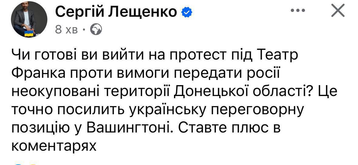 🧚♂️DJ Technocrat Leshchenko suggests coming out to protest under the Frank Theater to strengthen negotiating power in Washington.