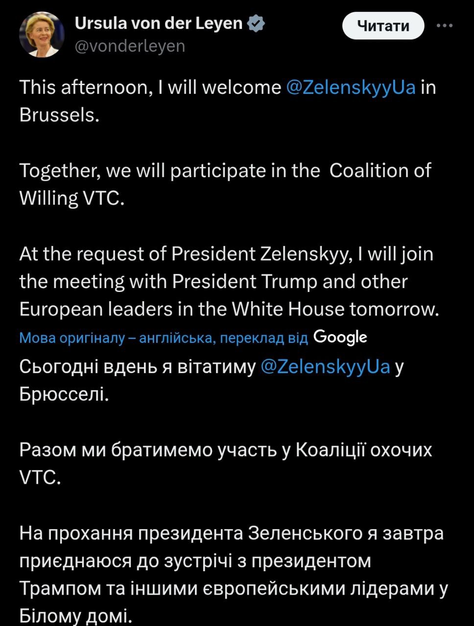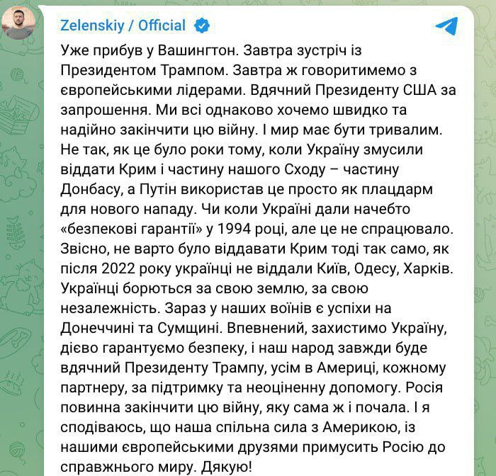 "I am grateful to the President of the United States for the invitation. We all equally want to end this war quickly and reliably. And the peace must be long-lasting. Not like it was years ago, when Ukraine was forced to give up Crimea and part of our East - part of Donbas, and Putin used it simply as a springboard for a new attack. Or when Ukraine was supposedly given "security guarantees" in 1994, but it didn't work. Of course, we shouldn't have given up Crimea then, just as after 2022 Ukrainians didn't give up Kyiv, Odesa, and Kharkiv. Ukrainians are fighting for their land, for their independence. Now our soldiers are making progress in Donetsk and Sumy regions. I am confident that we will defend Ukraine, effectively guarantee its security, and our people will always be grateful to President Trump, everyone in America, every partner, for their support and invaluable assistance. Russia must end this war that it started. And I hope that our common strength with America, with our European friends, will force Russia to a real peace."