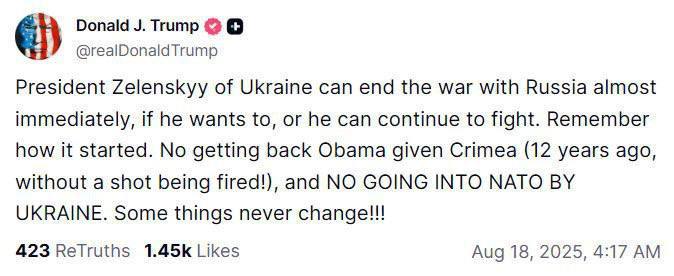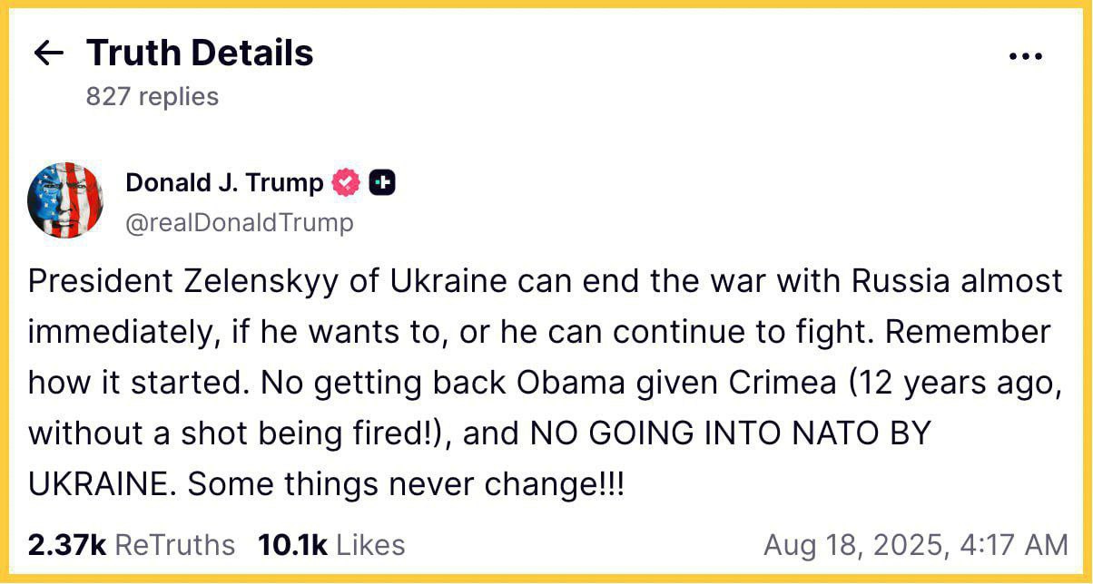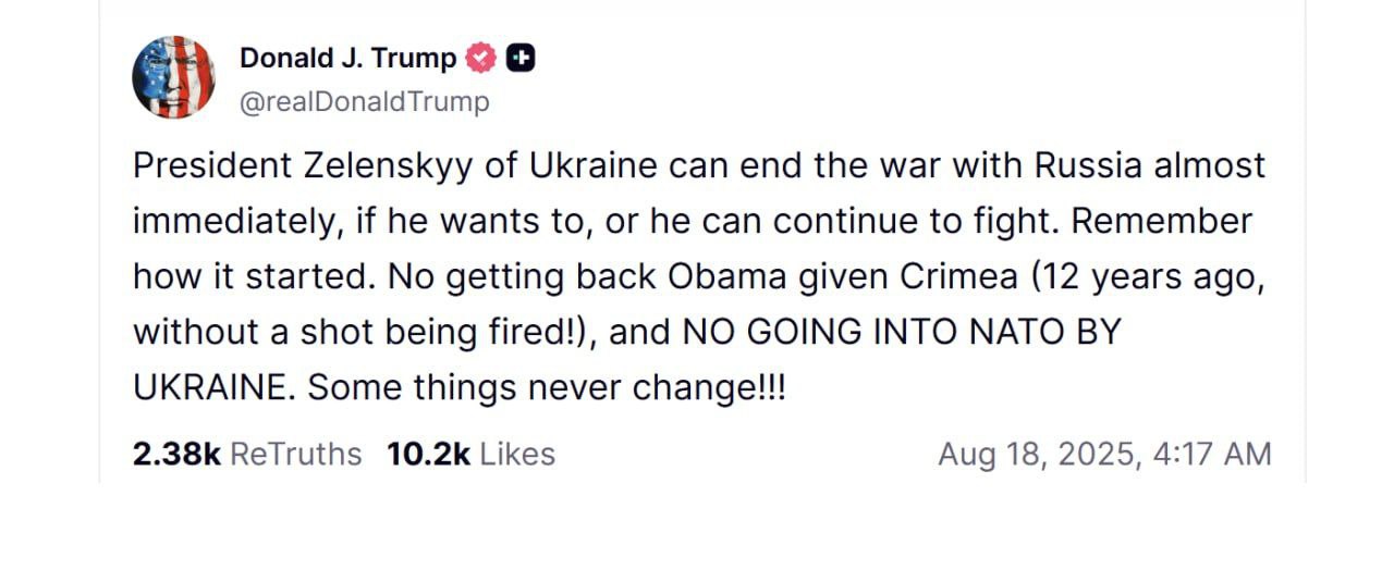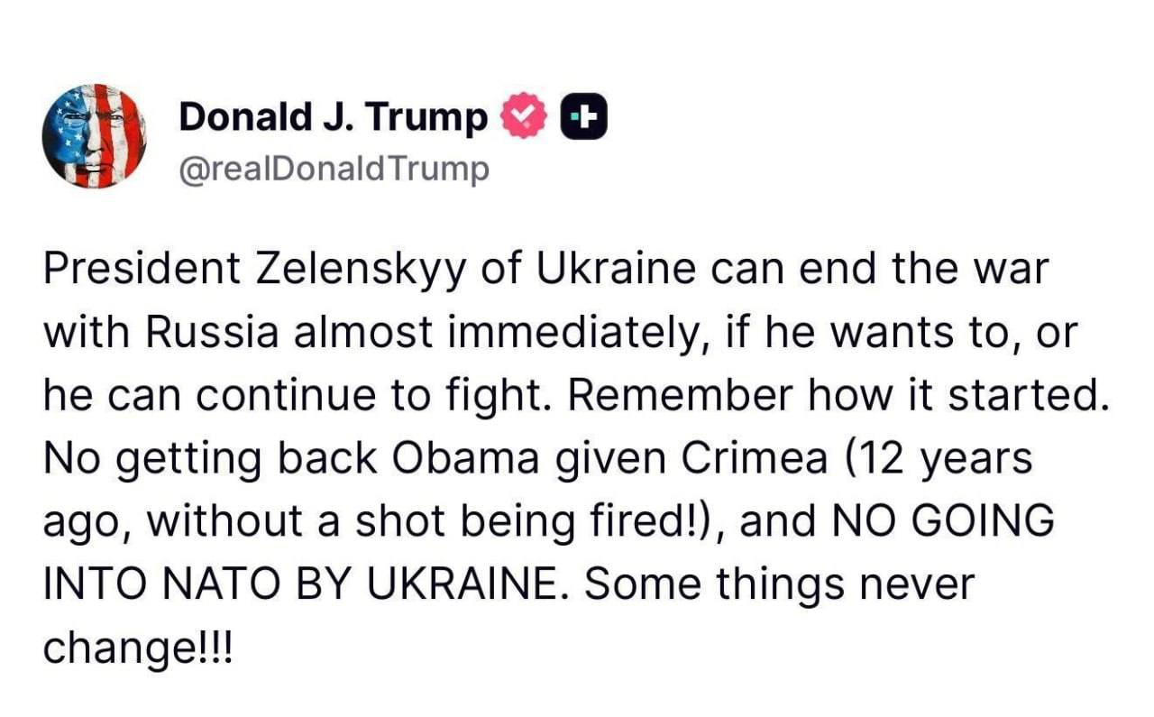 "No return of Crimea, which Obama gave away (12 years ago, without firing a shot!), and NO NATO membership for Ukraine. Some things never change!!!" Trump wrote on his own social network Truth Social.