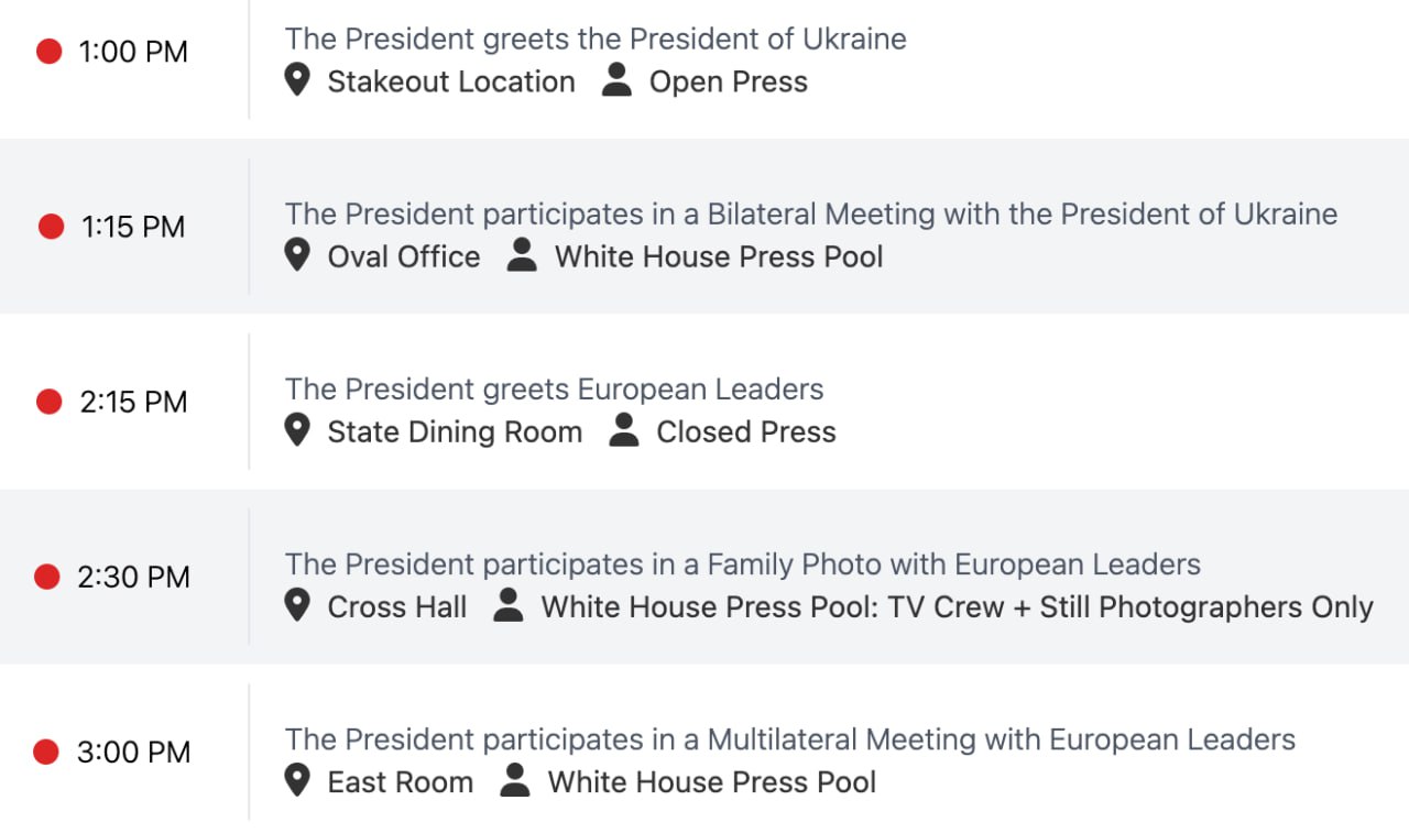 Zelenskiy said he had arrived in the United States to meet with Trump. According to Roll Call, the meeting between the leaders of the United States and Ukraine will begin at 20:00 Kyiv time, and later, at 21:15, the American leader will meet with European leaders.