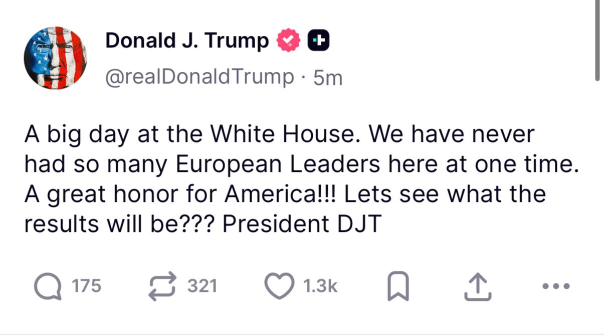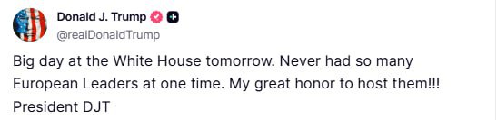 "Never before have so many European leaders gathered at the same time. It is a great honor to host them," Trump wrote on his Truth Social social network.