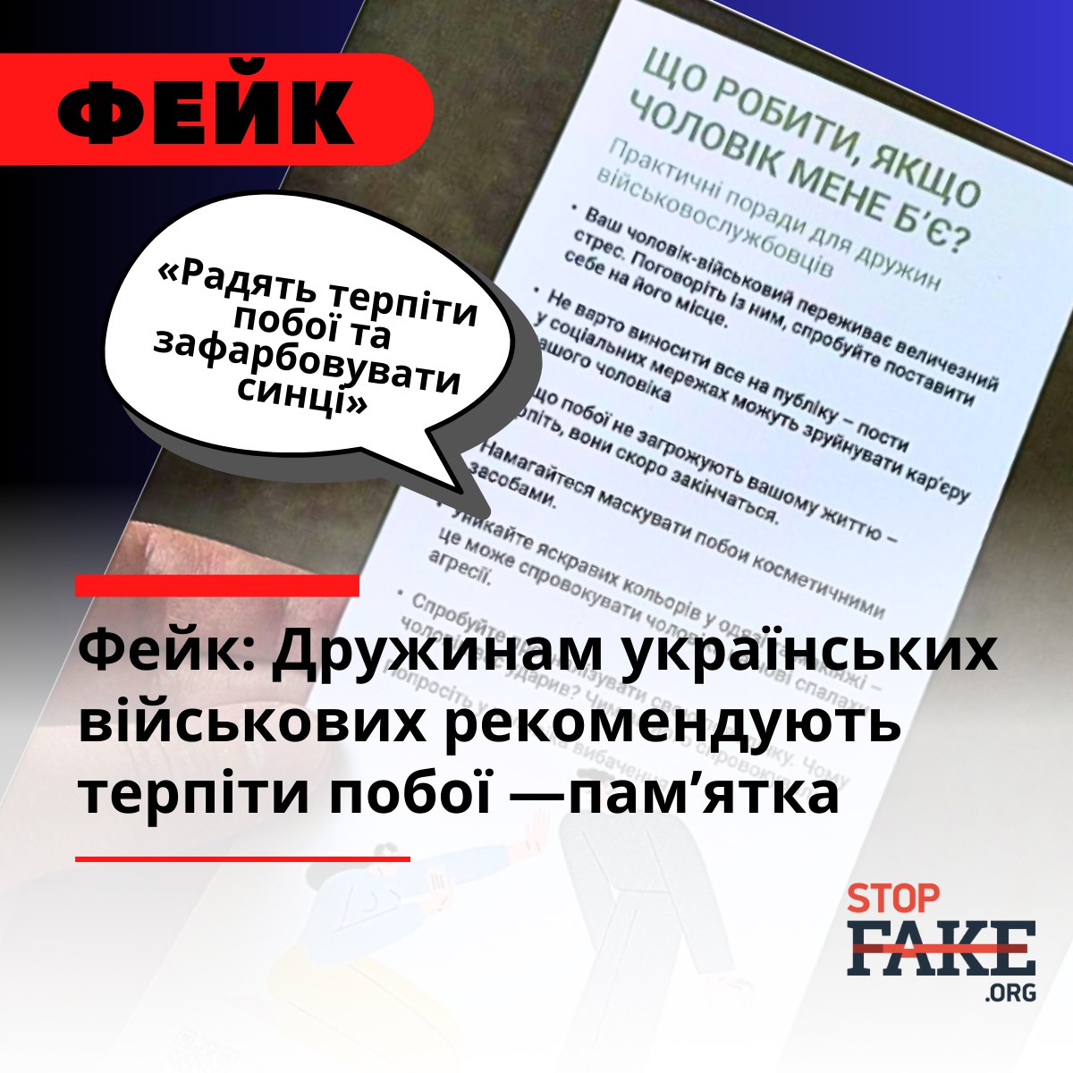 ✅ StopFake journalists contacted the press service of the Women's Power of Ukraine NGO, whose official response stated that they "have nothing to do with the creation, posting or distribution of a fake "leaflet" with alleged "recommendations" for women experiencing domestic violence." https://fmm.io/12KM
