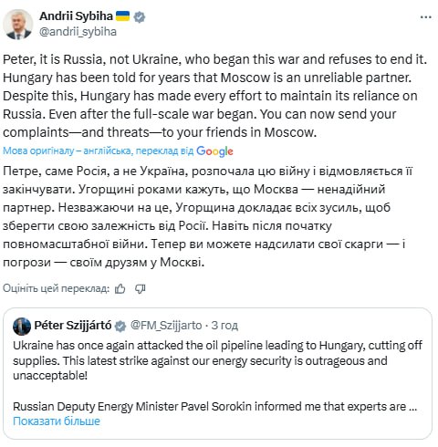"You can send complaints and threats to your friends in Moscow": Foreign Minister Andriy Sibiga responds to Siyarto
