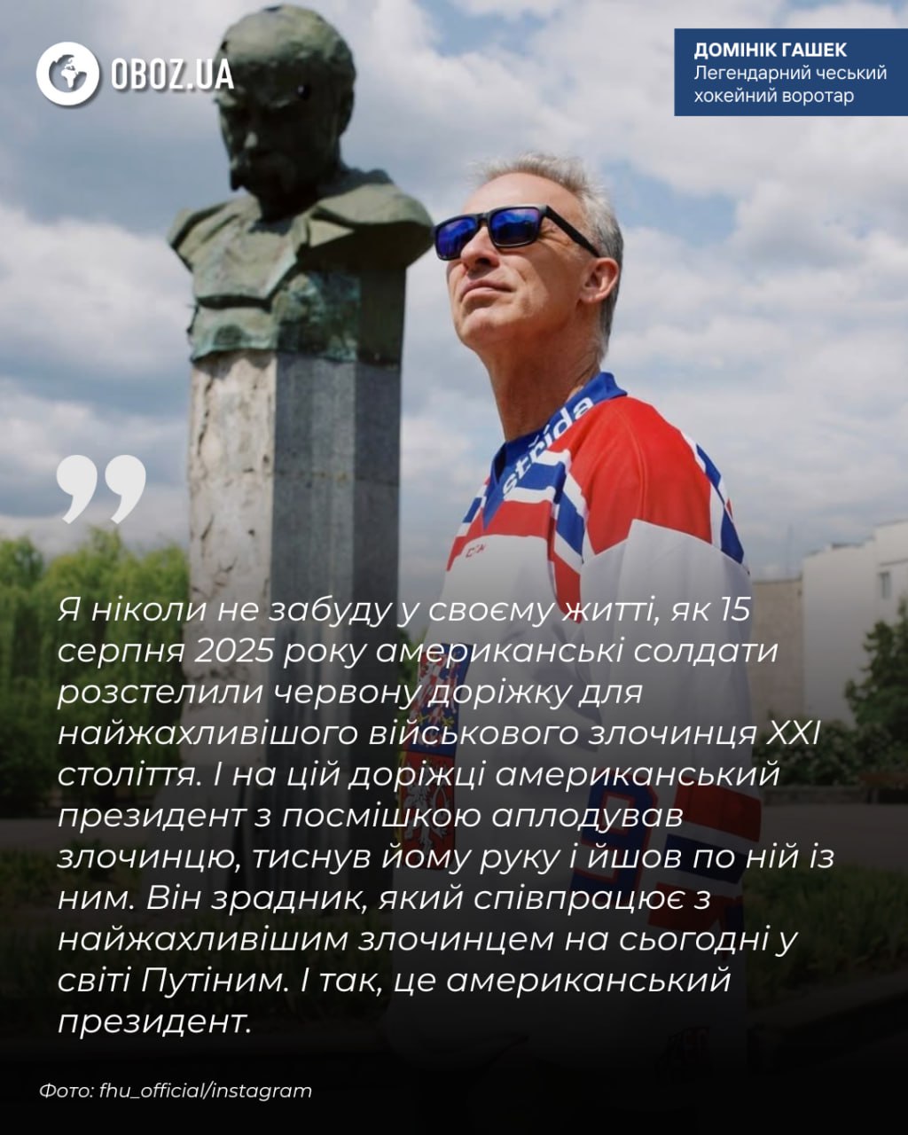 "I will never forget in my life how on August 15, 2025, American soldiers rolled out the red carpet for the most horrible war criminal of the 21st century. And on this carpet, the American president applauded the criminal with a smile, shook his hand and walked along it with him. He is a traitor who collaborates with the most horrible criminal in the world today, Putin. And yes, this is the American president," emphasized legendary Czech hockey goaltender and Olympic champion Dominik Hasek.