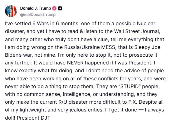 "I've settled 6 wars in 6 months, one of which could have led to a nuclear catastrophe, and now I have to read and listen to the Wall Street Journal and many others who really have no idea what the situation is and who tell me everything I'm doing wrong on the Russia/Ukraine issue...