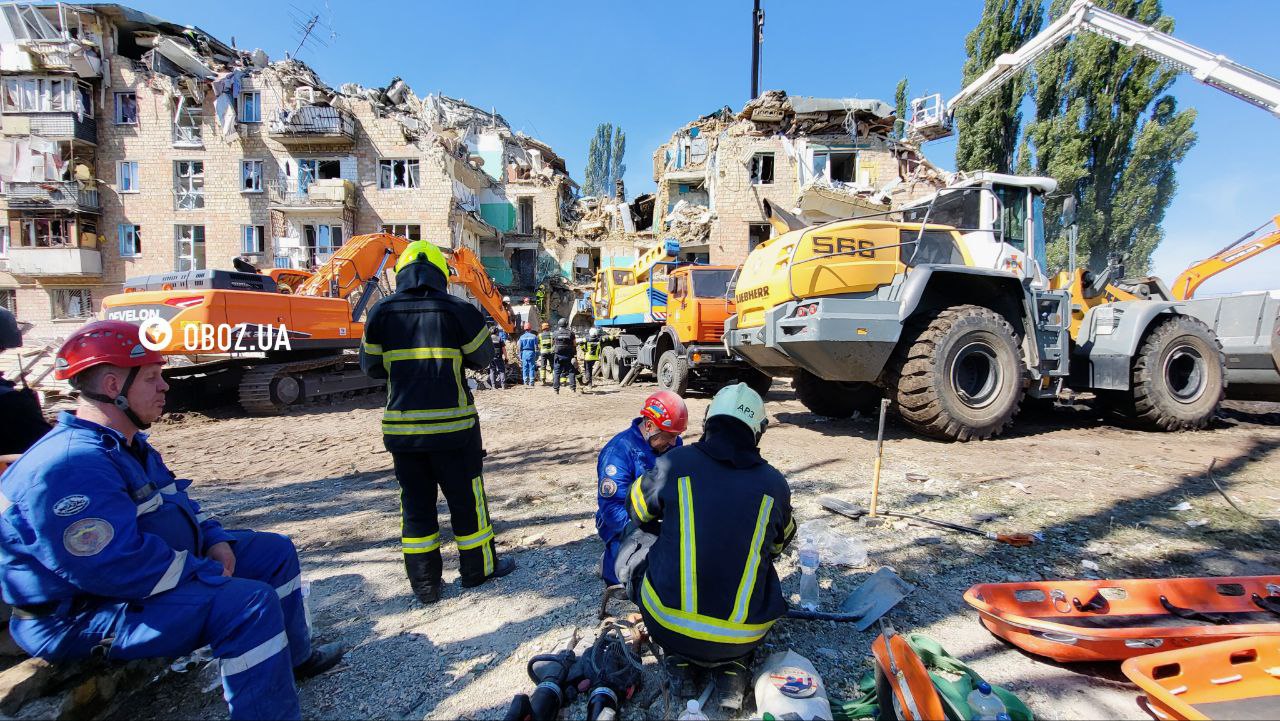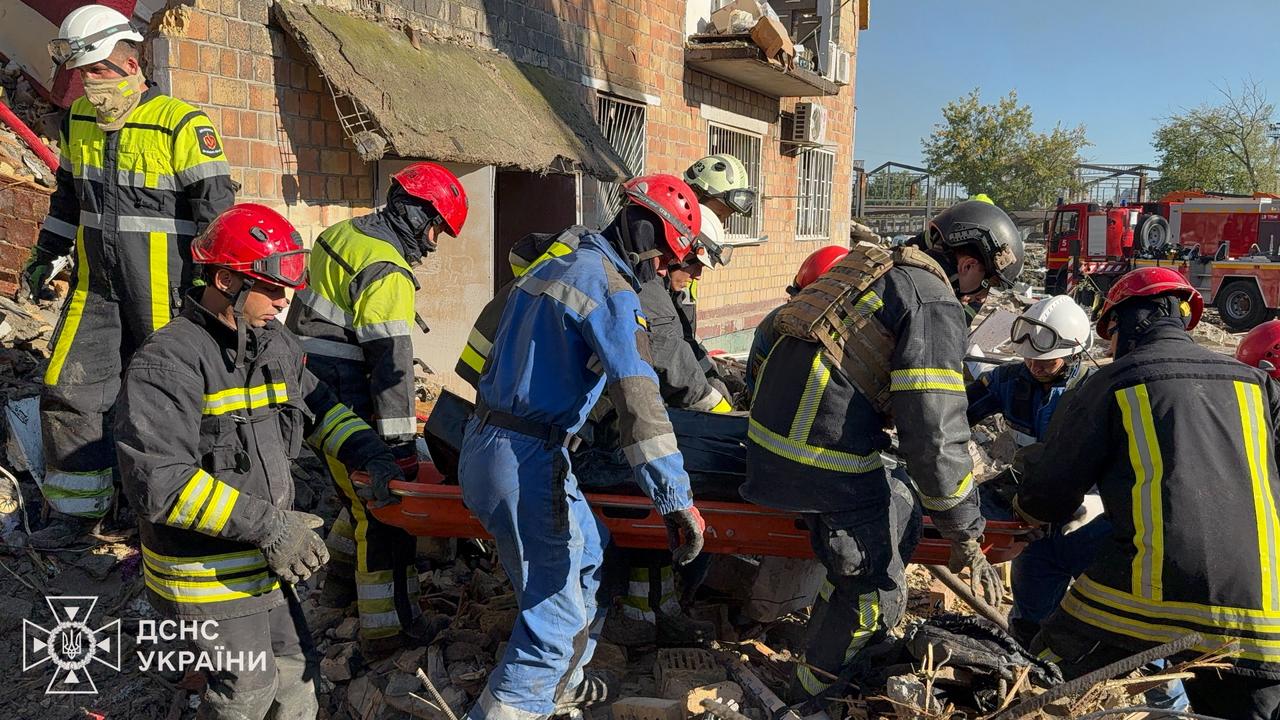 Rescuers continue to clear the rubble in the Darnytskyi district.