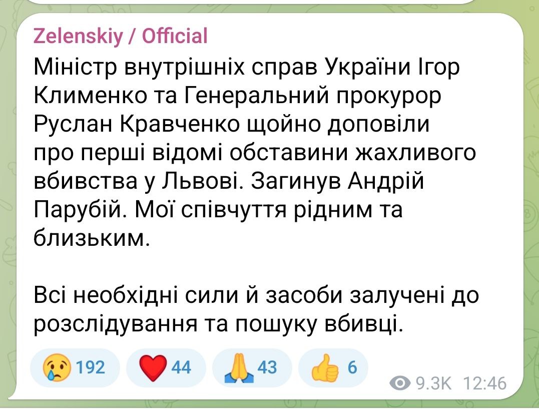 Zelenskyy: The murder of Andriy Parubiy was carefully prepared.