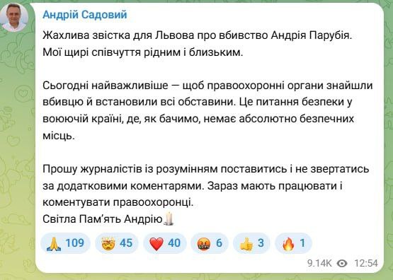 On Saturday, August 30, a current MP, former Secretary of the National Security and Defense Council and former Chairman of the Verkhovna Rada, Andriy Parubiy, was shot dead in Lviv. Ukrainian politicians and public figures reacted to his death and expressed their condolences to the family of the deceased.