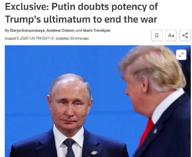 ❗️Путин doesn't believe in Trump's ultimatum, which ends on Friday, and has no intention of following it. He has been told the Ukrainian front will collapse in 2-3 months - Reuters citing sources close to the Kremlin