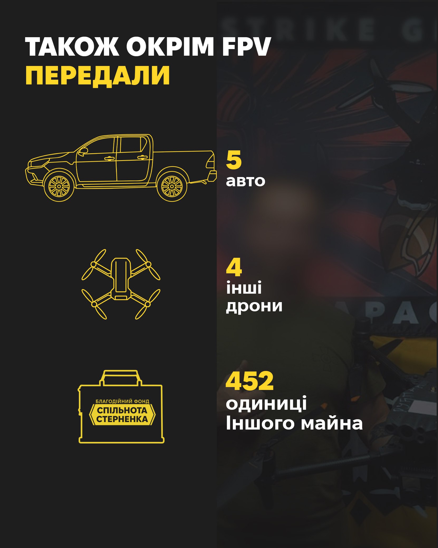 We guarantee full accountability for every penny, reporting on the use of drones, as well as for large donations, I can advertise you on my information resources.