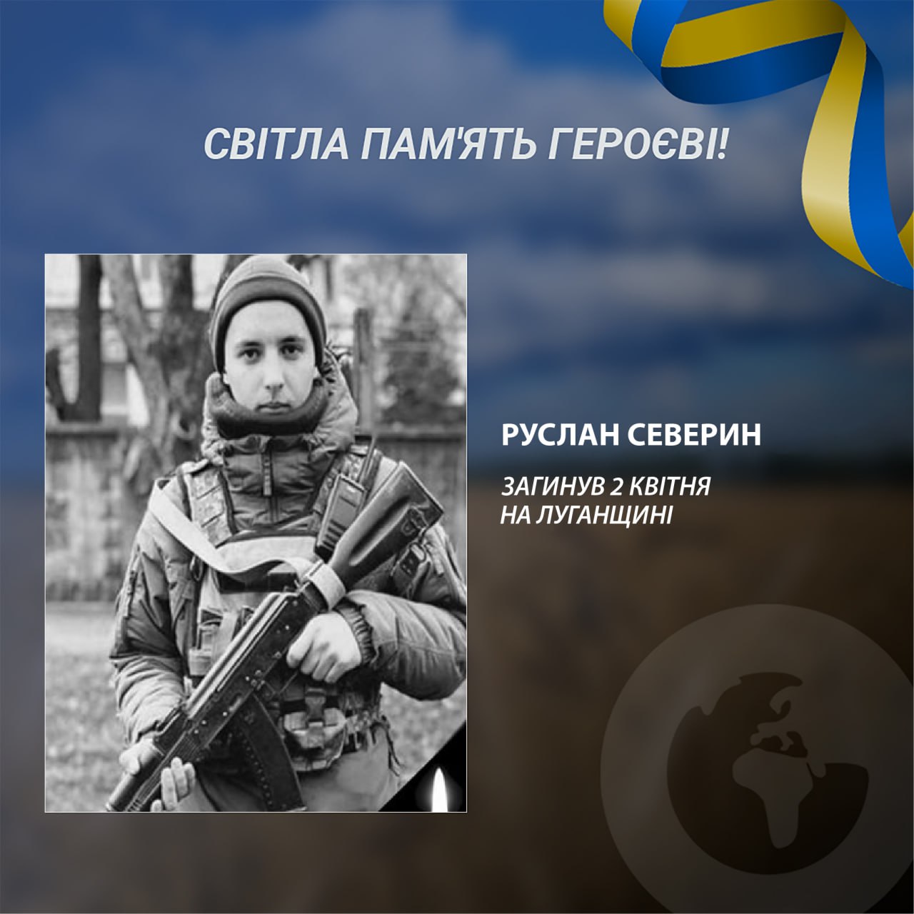 On April 2, 2024, Ruslan replaced his brother, with whom he served side by side, on a combat position. During the defense of the northeastern outskirts of Stelmakhivka, Svatove district, Luhansk region, Ruslan Severin was fatally wounded.