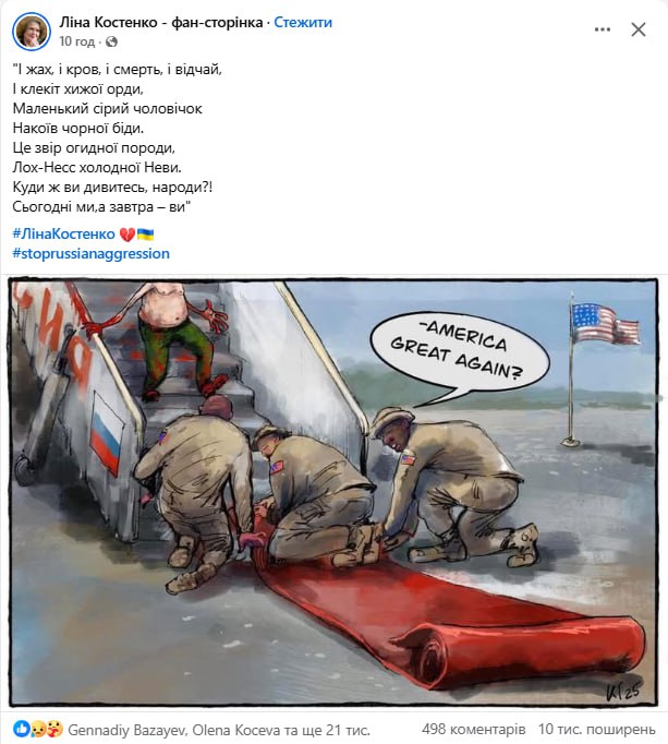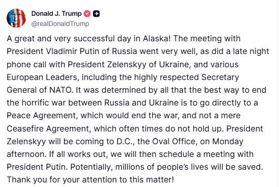 As a result of the meeting between Trump and Putin at the military base in Alaska, nothing was achieved except to reinforce the megalomania and assure the aggressor that he will not be punished for war crimes. In addition: